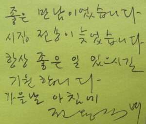 전용직 시인은 호병탁 시인 전정구 교수와 함께 우연치 않게 막걸리집에서 처음 만났습니다. 꽤 많은 얘기를 나눴던 것으로 기억이 됩니다만, 그 때 전시인이 서예에 조예가 깊은 줄은 전혀 눈치를 못챘습니다. 지금 생각해보니, 전시인이 그 만큼 과묵하다는 것을 느낍니다. 시인의 시는 시인의 글씨와 밀접한 관계가 있는 것 같습니다. 시집에 동봉한 짧은 메모를 봐도 단정하고 깔끔한 인품과 내공을 알 수가 있을 것 같았습니다. 몇 번을 봐도 보통 글씨체가 아닙니다. 시인이 쓴 시도 놀랍기는 마찬가지였습니다.