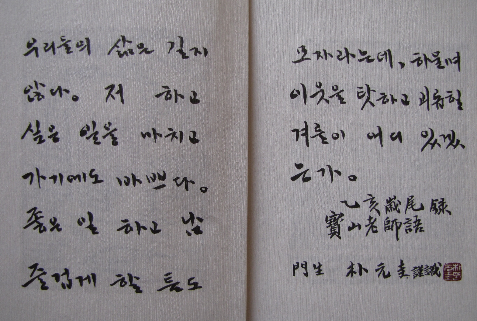 두 딸의 이름은 보라와 다원이라 지었다. 이 여인을 보라. 다원하는 사람이 되라. 뜻이 산보다 높고 바다보다 깊다. 효녀들이 심지를 잘 뽑아서 명문여고를 졸업하고 서울(에 있는)대학에 다녔으니, 귀한 아드님을 천안삼거리로 내치고, 예쁜따님을 제주도로 귀양보낸 부모님들에게 황송하였다.
