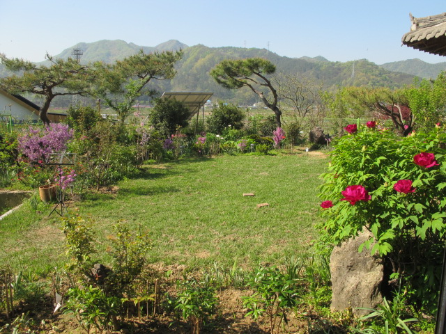거실에서 바라 본 정원 풍경입니다. 멀리 보이는 앞산이 ‘고덕산’입니다. 사학자이신 전영래 선생님의 말씀에 의하면, 전주에서 어머니와 같은 산을 모악산이라고 한다면, 아버지와 같은 산이 고덕산(고달산)이라고 한 답니다.