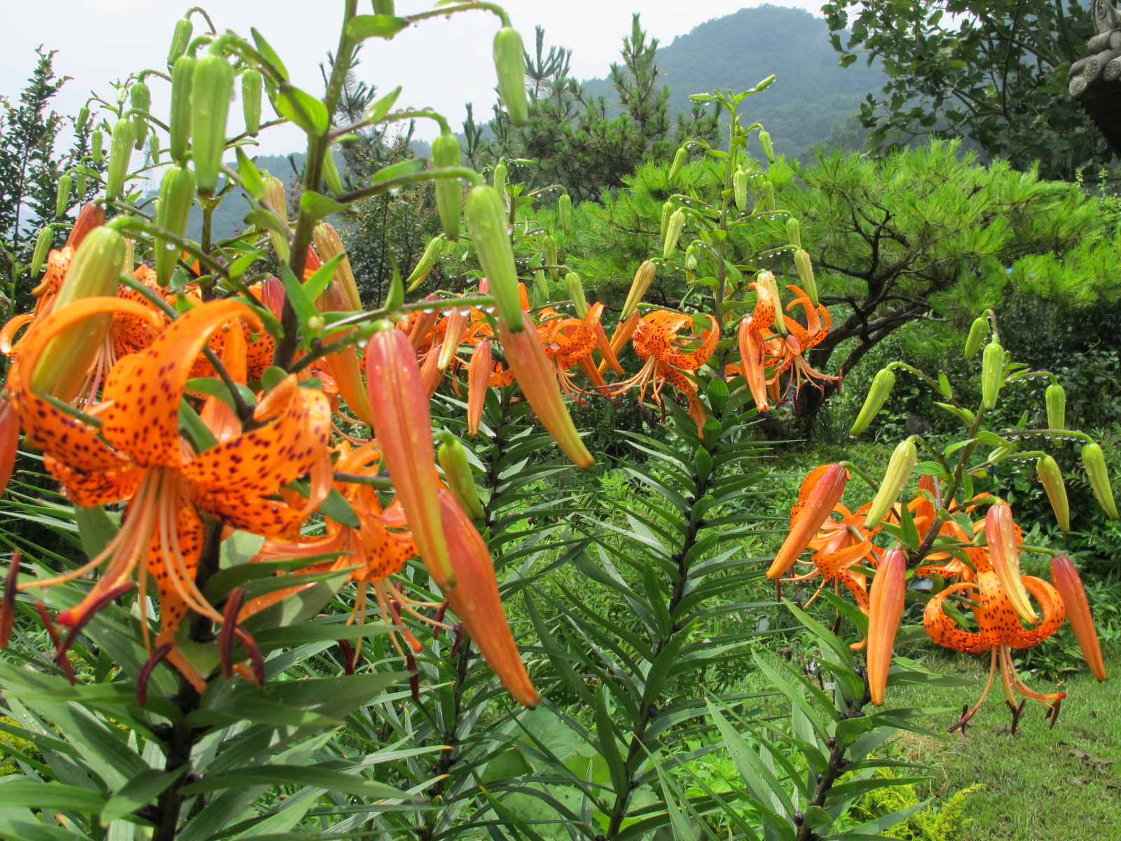 참나리꽃은 무주 산골짜기, 무풍에서 와서 이름이 ‘무풍댁’입니다. 무풍댁은 요염하기가 그지없습니다. 누가봐도 인적이 드문 시골에 두기는 아까운 절색입니다. 무풍댁이 우리집에 오게 된 것은 인연이 매우 깊습니다. 무려 1969년까지 거슬러 올라갑니다. 공주사범대학은 공주 봉황산 밑에 있었습니다. 그때도 친구 서병직은 나이가 잔뜩 들어보였습니다. 나이드신 교수님들하고도 거의 비슷하게 대화를 나눌 정도로 이미 노숙하고 노련한 면이 많았습니다. 공주사범대학 부속고등학교를 나왔는데, 고등학교 다닐때, 그 당시 부속중고등학교 교정에 가득찼던, 개나리꽃을 심었다고 합니다. 친구는 초임발령을 안면도중학교로 났었습니다. 거기 안면도 가서도 학생들과 함께 안면도 바닷가에 있는 해당화를 캐다가 학교 울타리에 심었다고 합니다. 그 친구 소식이 끊겼다가, 몇 년전 연락이 닿았습니다. 그동안 친구는 무풍에서 달성서씨 종중사업을 엄청나게 하고 있었습니다.
