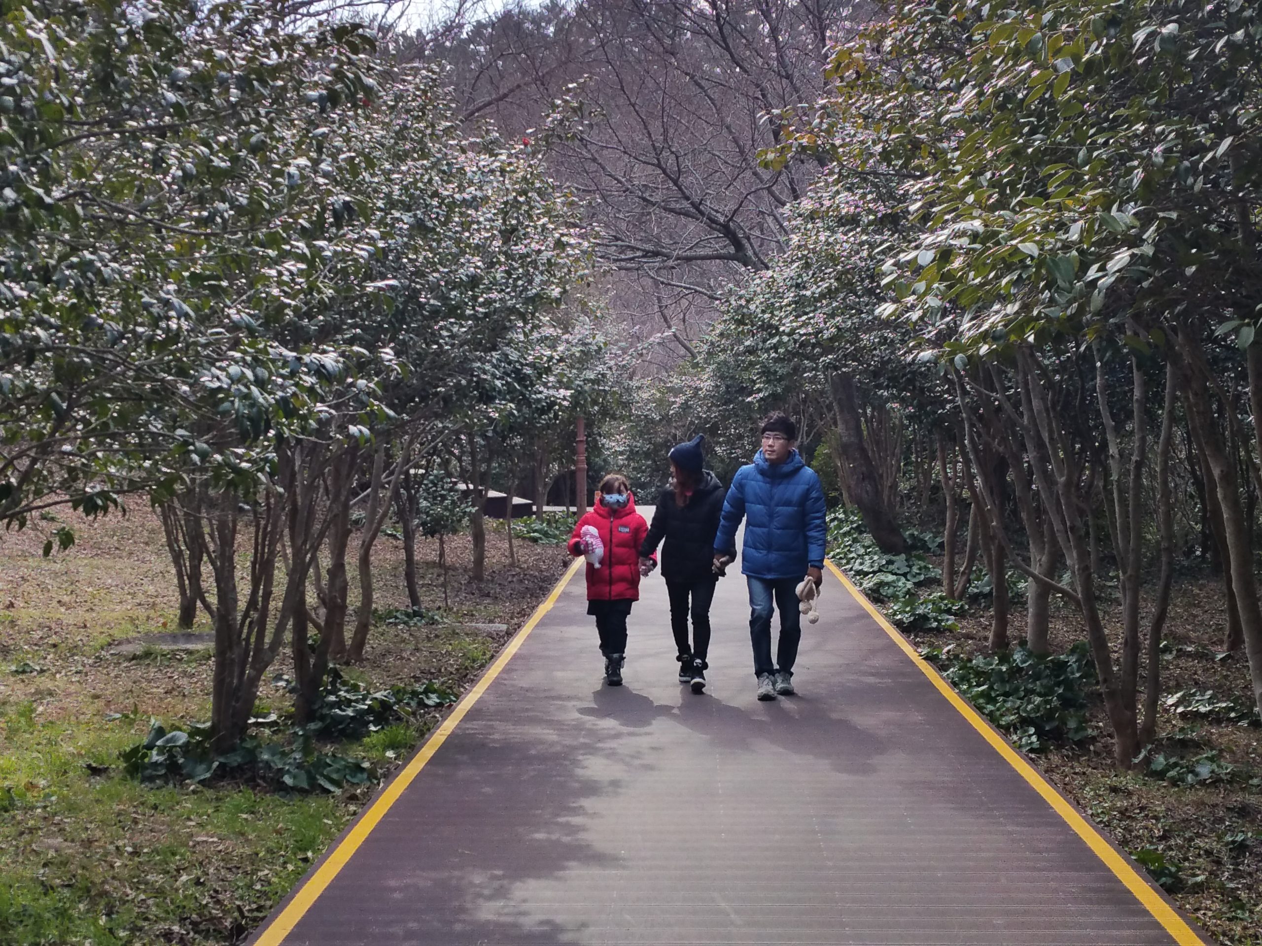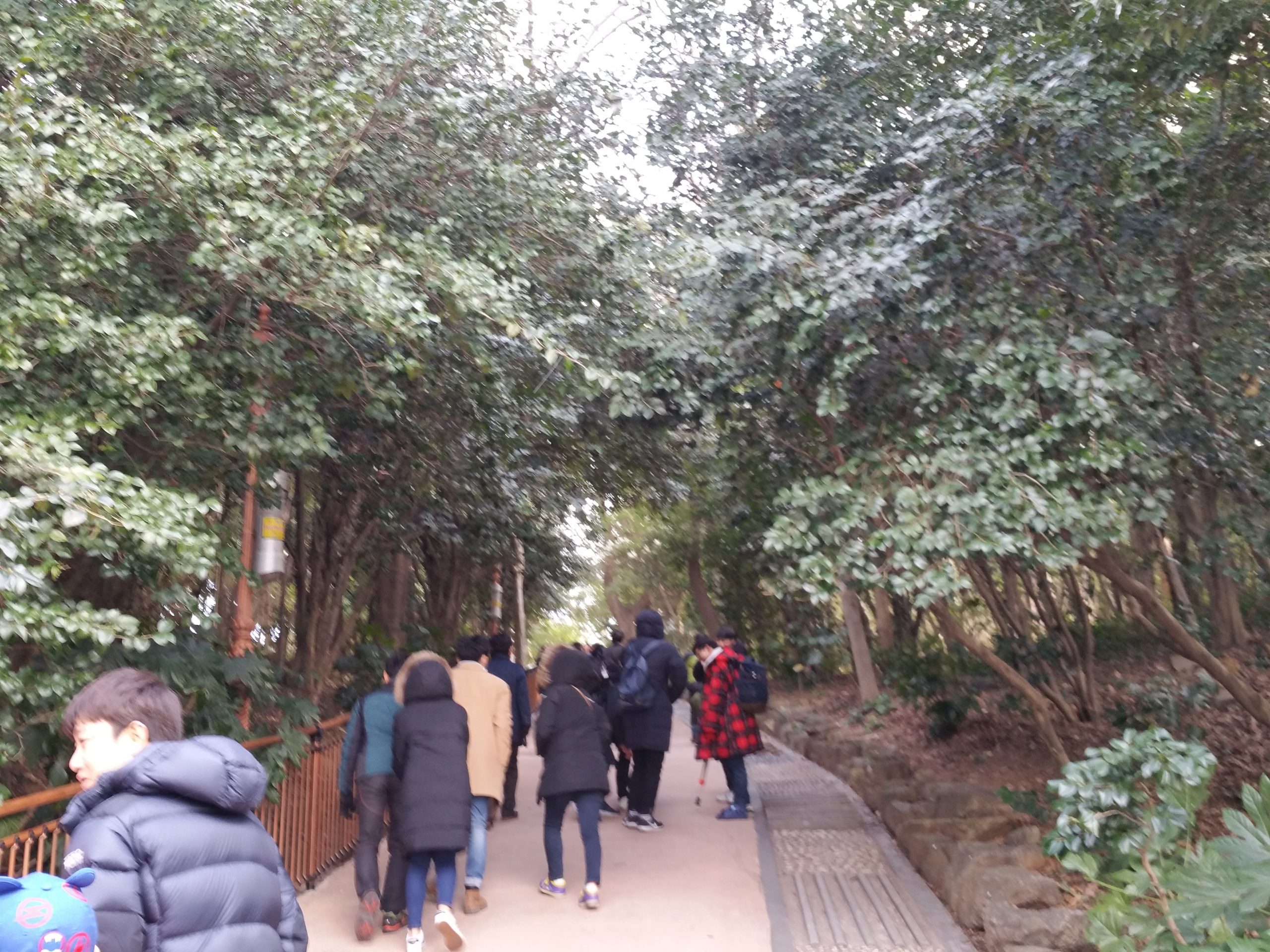 음식점 바로 뒷쪽에서 오동도 신책로가 시작 되었습니다. 동백꽃은 안 피었지만 싱싱한 동백이파리의 동백숲이 터널을 이루고 있었습니다.