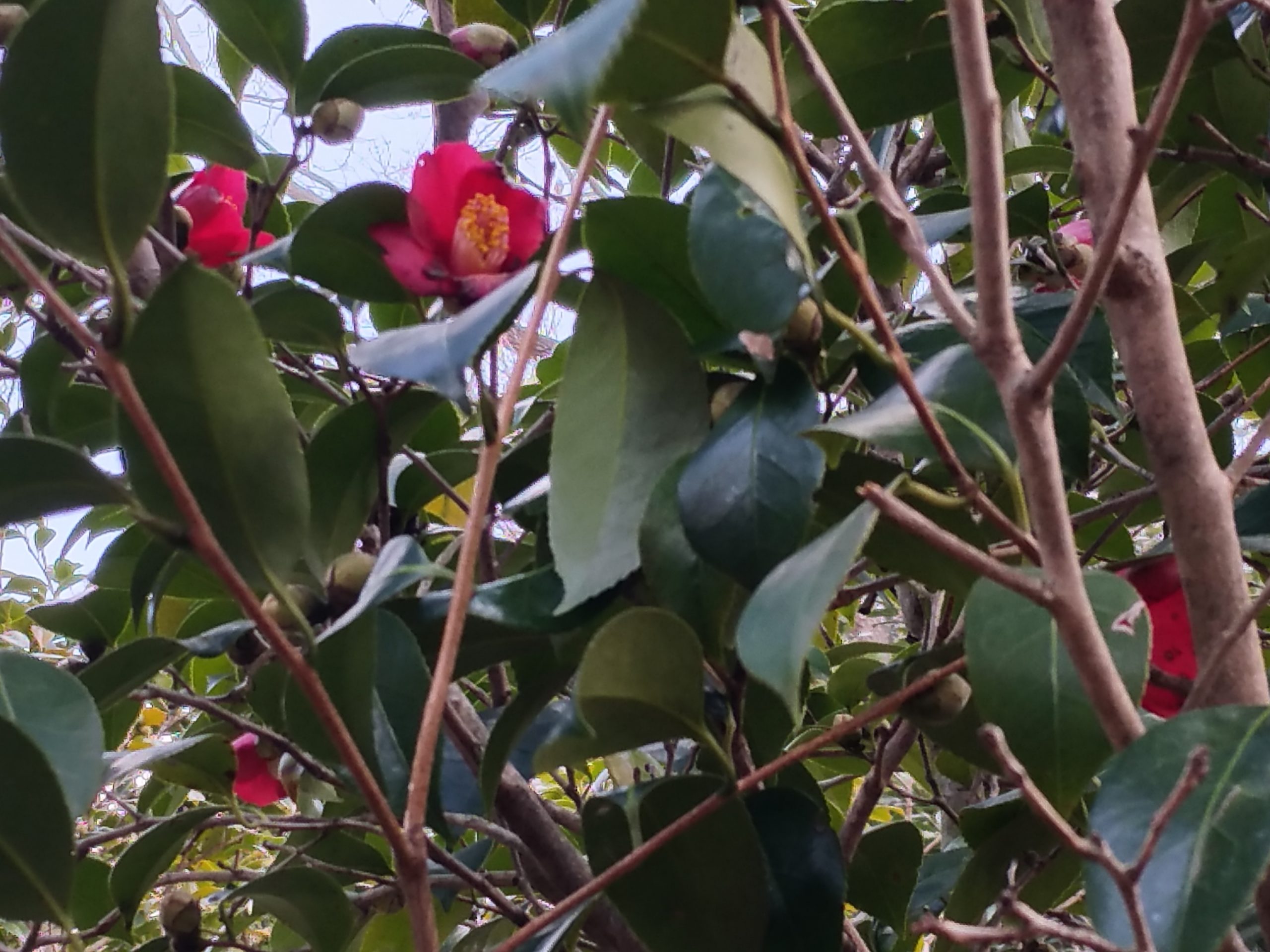 동백꽃은 어쩌다 몇 송이씩 피어 있었습니다. 홑동백이 작고 촌스럽게 보였습니다. 개량종보다 그렇게 작고 수줍은 모습을 사랑하는 사람들이 더 많습니다.
