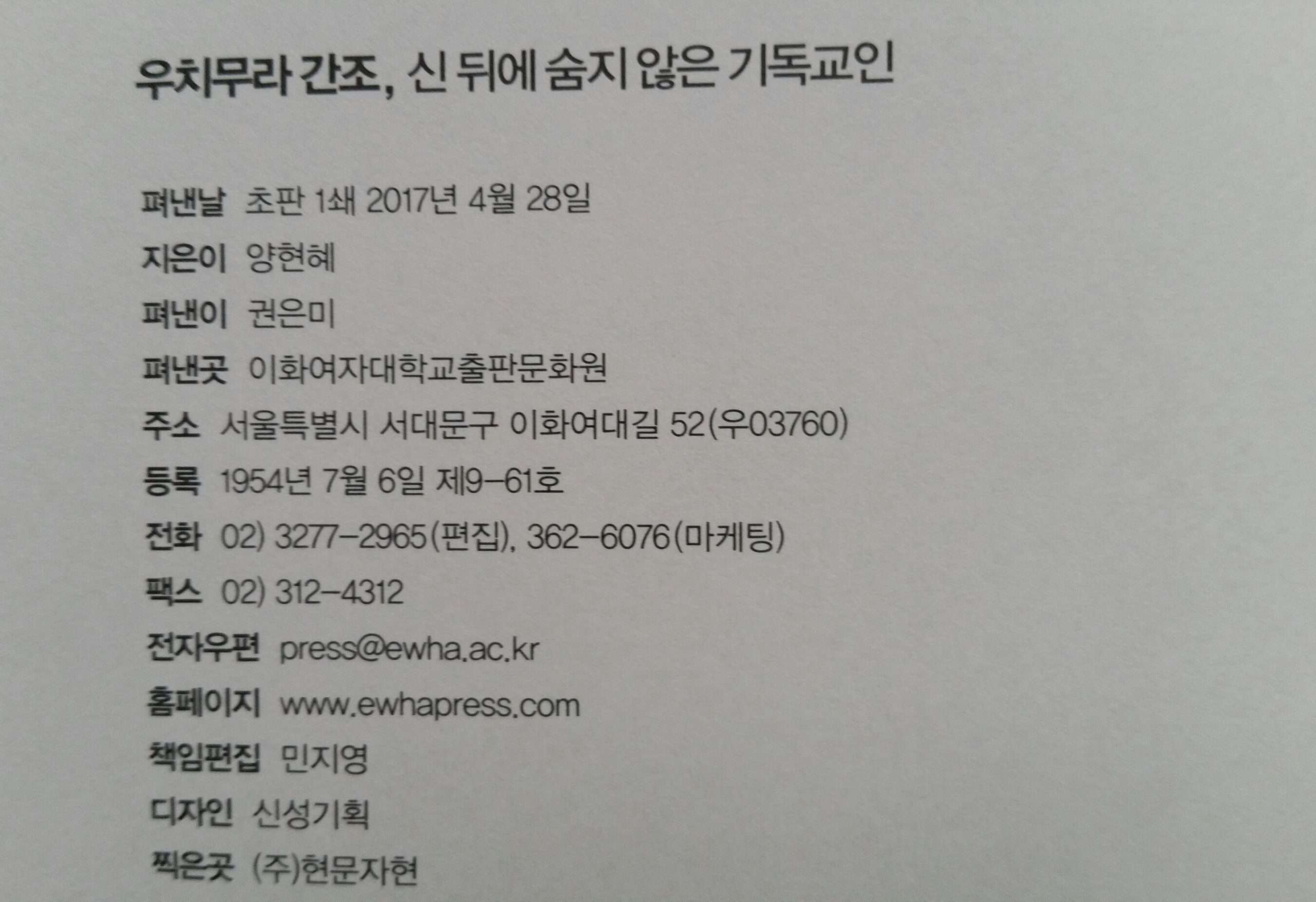 ‘신 뒤에 숨지않은 기독교인’ Post author:anyone Post published:2017년 07월 14일 Post category:익히며 즐겨요 우리들에게 김교신 선생의 스승으로 알려진, <‘우치무라 간조’ 신 뒤에 숨지 않은 기독교인>이라는 책이 나왔습니다.현재 이화여자대학교 기독교학과 교수로 재직 중인 양현혜 교수가 쓴 책입니다. 을하 You Might Also Like 플루티스트 ‘시게노리 구도’의 연주회 2010년 11월 05일 놀래미 암수, 어떻게 압니까? 2009년 11월 07일 <체 련> ” 태극권을 배워요.” 2014년 01월 03일 답글 남기기 응답 취소You must be logged in to post a comment.