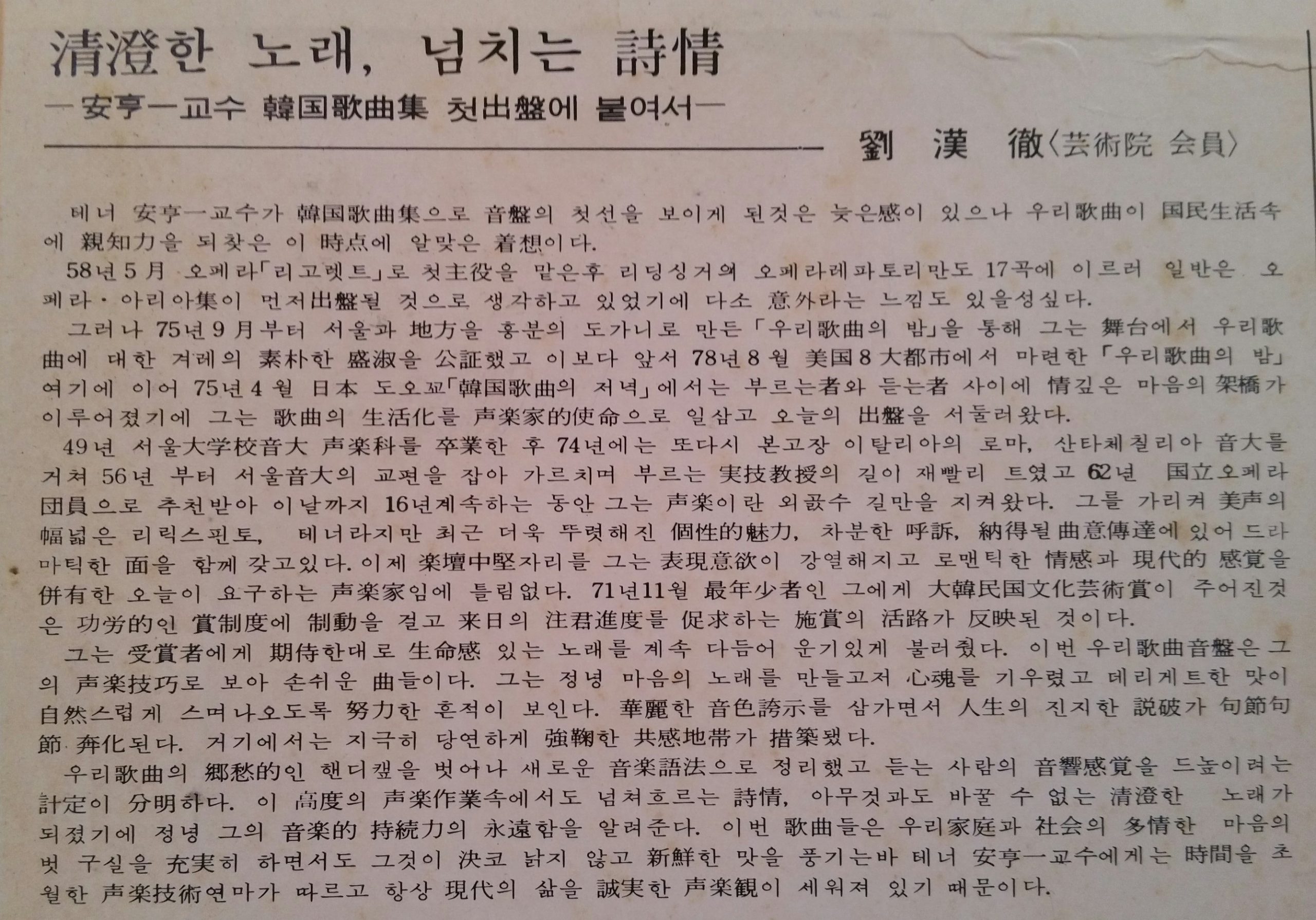 유한철 선생님이 글을 써 주셨는데, 유 선생님은, 자세한 기억은 안 나지만, 음악을 전공한 분이 아닙니다. 음악평론뿐만 아니라, 미스 코리아 대회의 단골 심사위원이셨고, 뭐, 취미로 코르넷을 불었다는 얘기도, 제 기억 자체를 믿을 수가 없습니다. 하여튼 ‘르네상스 맨’을 추구하셨던 분입니다.