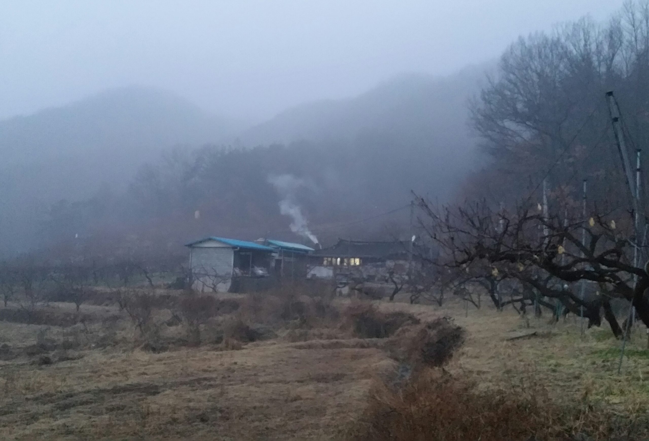 포근한 겨울 아침, 안개속에 과수원집 굴뚝에서 연기가 피어오릅니다. 이곳은 시골이라 일찍 일어나야 학교도 가고 직장에도 나갑니다. 날이 밝기 전에 어둠속에서 시계를 보고 일어납니다. 방에 불울 켜고 아궁이에 불울 지핍니다. 요즘 유류값이 만만치 않아서 화목보일러로 난방을 하는 집이 많습니다. 그러니까, 보일러 굴뚝에서 나오는 연기인지도 모르겠습니다.