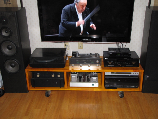 사진: 수납 후의 모습기기들을 수납한 모습입니다. TV는 바닥에 앉아있을 때의 눈 높이로 낮게 걸었습니다. 장시간 고개를 쳐들고 보다보면 목디스크에 걸릴 위험이 많습니다. 사진에 보이는 기기는, 왼편 위에서부터 시계바늘방향으로, 토렌스 턴테이블, 메킨토시 진공관 튜너(1964년제), 유선TV 모뎀, 소니 더블카셋트덱, 일본위성방송디지털튜너, 홈씨어터DVD튜너5.1앰프, 삼성 DVD 비디오 콤비, 진공관 파워앰프(이명현 제작), 진공관 프리앰프+파워서프라이(이명현 제작) 입니다.