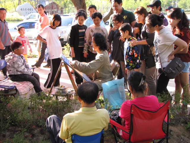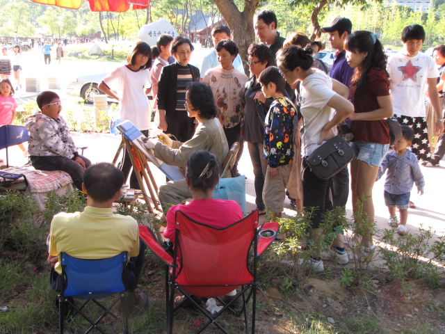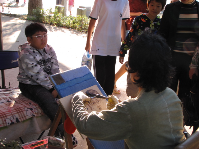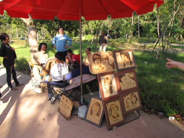 어느 곳에 사람들이 제법 웅성웅성 모여있어서 가봤습니다. 바로 ‘인두화’를 구경하는 사람들이었습니다. 즉석에서 나무판에 인두로 지져서 인물화를 그립니다. 사람을 앞에 앉혀놓고 보면서 지지니, 사람들의 관심을 끕니다. 그림이 실물과 얼마나 비슷한지 바로 알 수가 있어서 재미가 있는 것입니다. 인두화를 그리는 모습이 보기에 좋았습니다. 의자에 앉아있는 분들이 고객, 그러니까, 부모님 같습니다. 튼튼하게 잘 생긴 아들을 바라보는 모습이 여유롭습니다.
