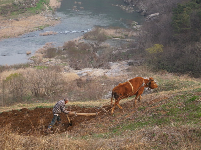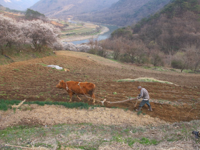 매화꽃이 흐드러지게 핀 강 언덕이 보고 싶었습니다. 언젠가 다녀온 임실군 덕치면 천담리 구담마을이 떠올랐습니다. 옛날에 갔을 때는 계절이 쌀쌀한 늦가을이었습니다. 신발을 벗고, 발목을 적시며 차가운 냇물을 건넜던 기억이 났습니다. 그 때, 마을 언덕에 매화 밭이 눈에 들어왔고, ‘봄철에 다시 오면 참 좋겠구나.’라고 생각했습니다. 매화꽃이 피는 철이 이른지 늦은지도 모르고 갑자기 찾아갔지만, 그것도 해거름 판에, 제 때 제대로 찾아간 것이 되었습니다. 매화꽃이 강변에 흐드러지게 피었고, 냇가에는 맑은 물이 넘쳐흘렀습니다. 냇물이 넘쳐서 징검다리는 건너지 못했지만, 마침 어떤 어르신께서 소로 밭을 갈고 계셔서, 모처럼 정겨운 장면을 구경하기도 했습니다. 물론 그 모습을 사진으로 담을 수도 있었습니다.