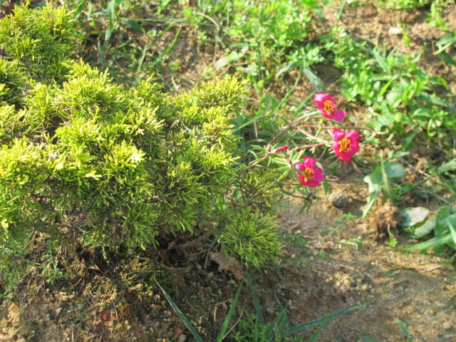 진백은 노란잎이 보기가 좋습니다. 잎이 노란 것은 잔뿌리가 별로 없고 영양이 항상 부족하기 때문이 아닌가 합니다. 뿌리가 부실하기 때문에 옮겨심기도 어렵습니다. 몇 그루는 죽고, 몇 그루만 살았는데, 덤으로 핀 빨간 채송화가 위로가 됩니다.