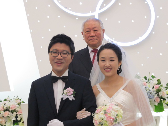 사진 1: 주례 윤길원 시원교회 원로목사님과 함께 기념촬영하는 모습