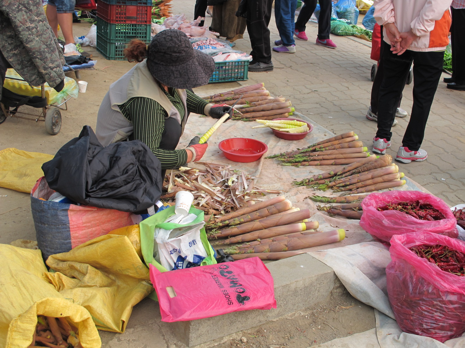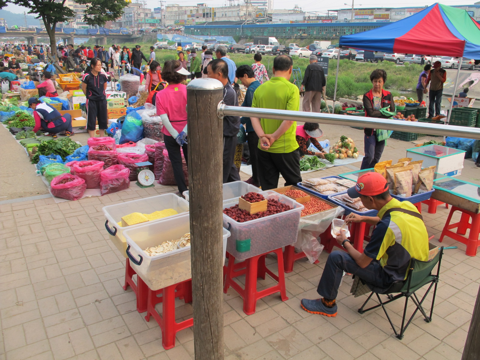 몇가지 견과류를 파시는 한 남자분이 눈에 띄였습니다. 아침 식사를 하는지 무엇을 고부라지게 열심히 먹고 있었습니다. 사진에는 나타나지 않습니다만, 제가 일부러 다가가서 보았습니다. 먹고있는 것은 밥이 아니고 새우젓이었습니다. 밥은 다 먹고 반찬으로 남은 새우젓을 드시는 것인지 이해가 잘 안 되었습니다.