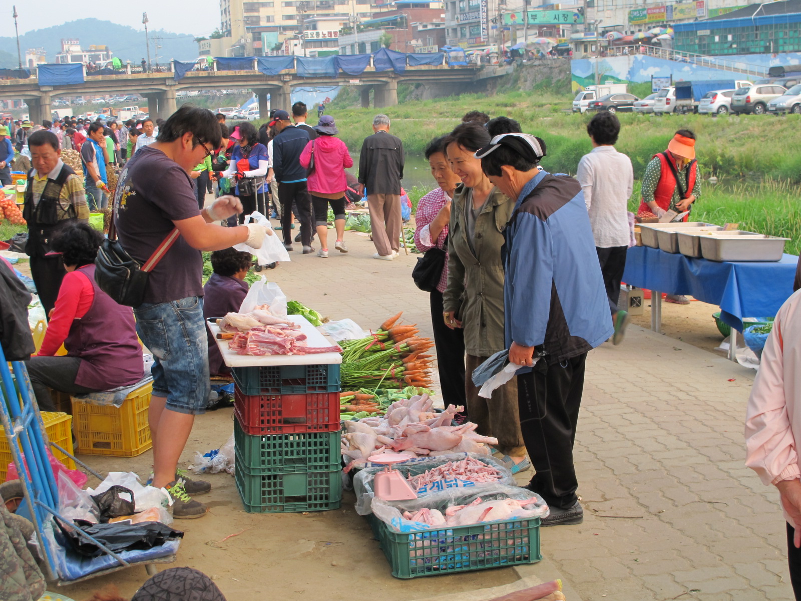 이 사진은 가운데 아줌마의 웃는 모습이 정겨워서 올렸습니다. 그런데 지금 다시보니 닭을 팔고 있는 청년의 모습이 눈에 익습니다. 생각이 났습니다. 남부시장 매곡교 근처에서 닭과 콩나물을 파는집 주인 아들 같습니다. 새벽시장에는 시골에서 보따리로 싸들고 오는 분들도 많지만, 전문적으로 시장에 점포를 가지고 장사를 하고있는 상인들도 많이 있습니다.